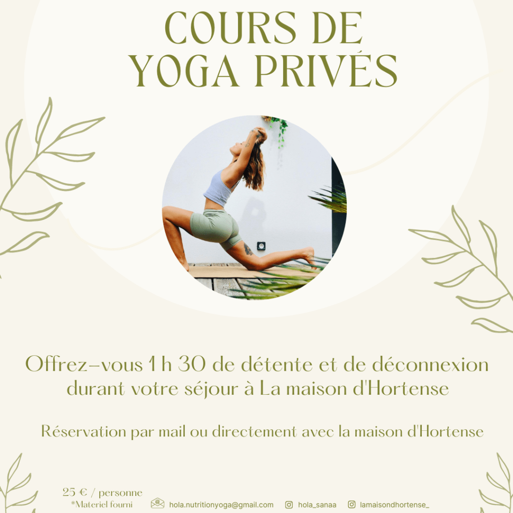 - Cours de Yoga privé, d’une heure et demi, matériel fourni, pour tous niveaux avec des conseils nutritionnels si vous le souhaitez. Coraline se déplace dans La Maison d’Hortense pour vous offrir détente, relaxation, bien-être et déconnexion. Tarif 25 euros. Pour réserver, je vous invite à me joindre : lamaisondhortense@outlook.com ou joindre Coraline : hola.nutritionyoga@gmail.com