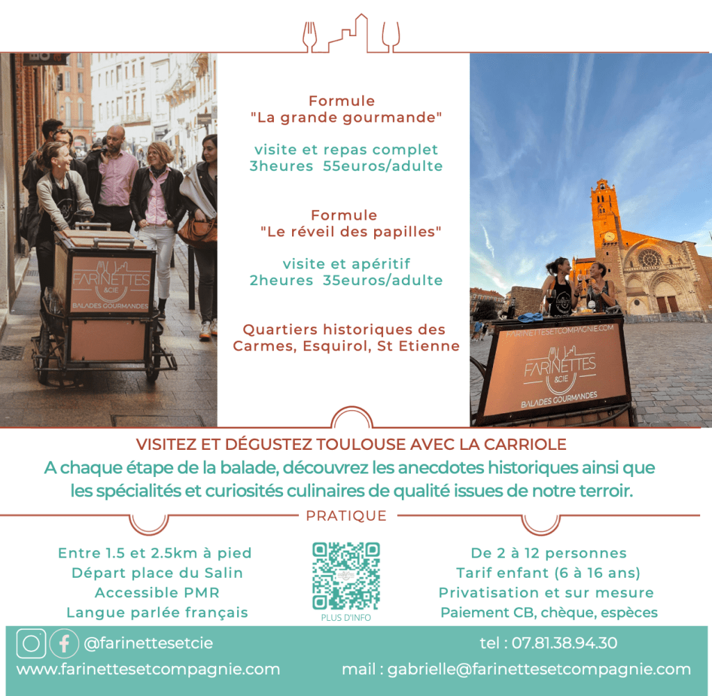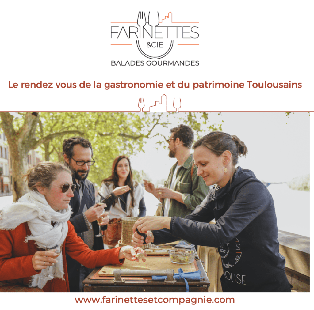 - Visiter et déguster Toulouse ! Balades gourmandes et culturelles ! Une promenade ou vous visiterez des places mythiques , en découvrant les anecdotes historiques ainsi que les spécialités et curiosités culinaires de qualité du terroir ! Un concept insolite qui ravie papilles et pupilles ! Uniquement de début Avril à fin Octobre. Pour réserver, un mail à lamaisondhortense@outlook.com ou à gabrielle@farinettesetcompagnie.com ou au +33 7 81 38 94 30