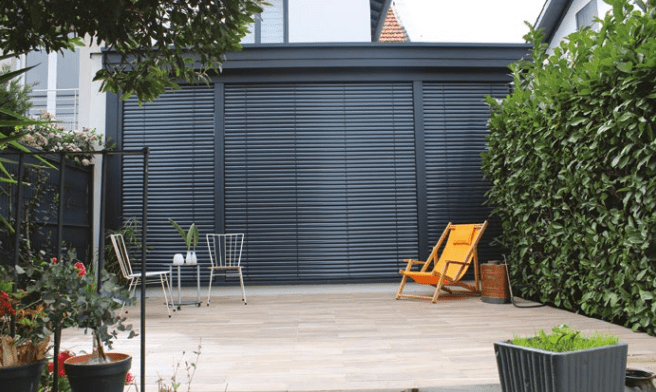 La véranda est agrémentée, sur sa face extérieure, de brisesoleils orientables (BSO). Deux pour les fixes latéraux et un pour la grande ouverture centrale. En aluminium, les trois BSO sont réglables par télécommande de façon indépendante en hauteur
